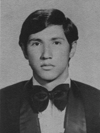 Célebremente conocido como, “Beto”, “Vampiro”, “Roñoso”, “Lindo”, “Caracolita”. Era uno de los hombres más “trabajadores” y “madrugadores”(?) de la generación, el día que se tomó esta fotografía, madrugó para ir al salón de belleza. Su mayor trauma era que lo despeinaran los negros... SU mayor pasatiempo era estarse peinando. Impuso el vocabulario más “exquisito” y “refinado” (?) de todo el colegio. No se le veía en los recreos, siempre estaba en un café en Plaza Patria, se le rumoraba un idílio secreto con la muchacha que atendía... Pensaba dársele el cargo de Presidente del Club de Gorrones, S.A., ya que a todos invitaba al café, pero nunca traía dinero... Inseparable de los Negros, pues ellos le sustentaban sus gorronadas. Enamoraba a las “Nenas” con su forma de tocar(?) la guitarra. Miembro muy quediro del grupo “Weeps” (era el que cargaba los instrumentos). su más grande anhelo era dar un concierto él solo ante el público de puras “Nenas”. Sus frases favoritas eran: “Minx...”, “Quiufas Canaquiufas”, “Vamos a tirar el rol...”, “Oye qué buena onda”, “Yo nomás me dejo querer”. Simpático, buen compañero y cuate de confianza.